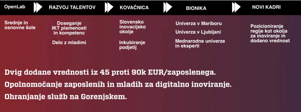 Bionika je srednjeročni projekt, ki pomaga gorenjskim podjetjem ohranjati in dvigati dodano vrednost skozi nova znanja in hitrejši dostop do bodočih sodelavcev. Opremljeni s temi sposobnostmi krepijo konkurenčnost celotne regije in Slovenije.